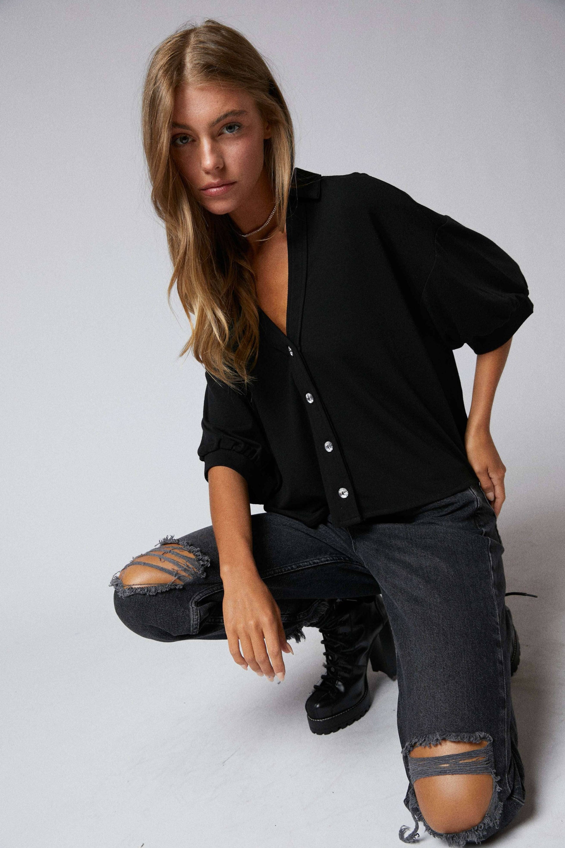 Elbow Sleeves W/Rhinestone Button Down Crop Shirt 96% Rayon, 4% Spandex Available in colors: Stone, Mauve, Black, Olive