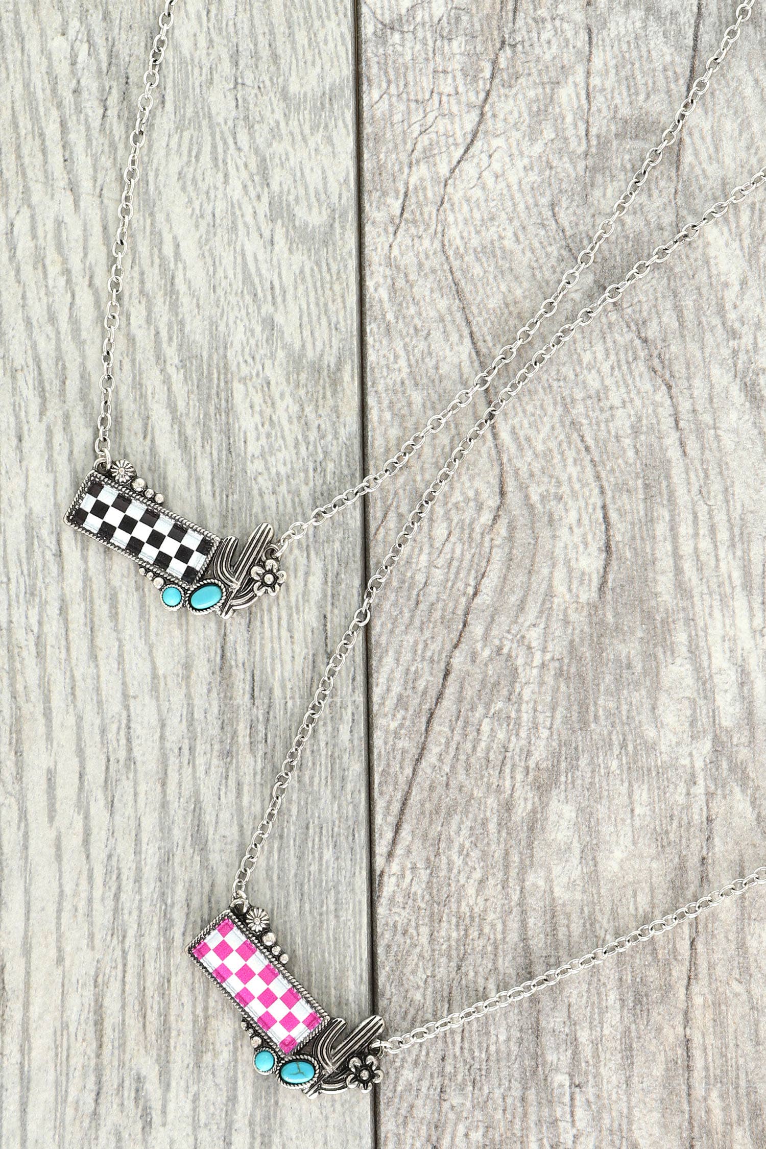 This Western Checkerboard Cactus Pendant Necklace is a unique and stylish piece for any jewelry lover. Hand-crafted with precision, the pendant features a stunning checkerboard cactus design that is sure to catch the eye. Made with high-quality materials, it is durable and timeless. Enhance your outfit with this beautiful necklace today.