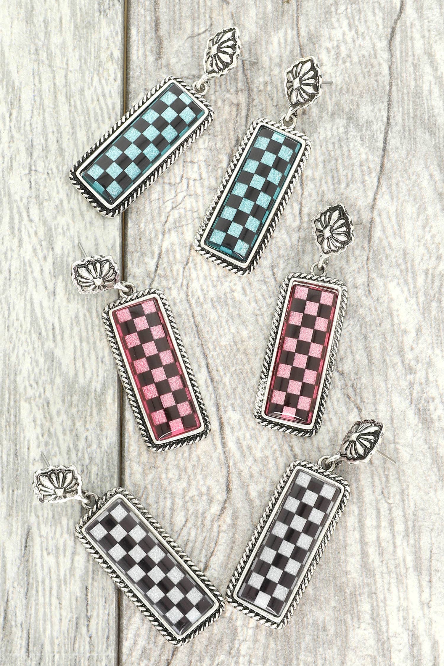 Expertly crafted with Western-inspired design, these bar post earrings feature a unique checkerboard pattern in durable epoxy. Add a touch of rustic charm to any outfit with these timeless and versatile earrings.