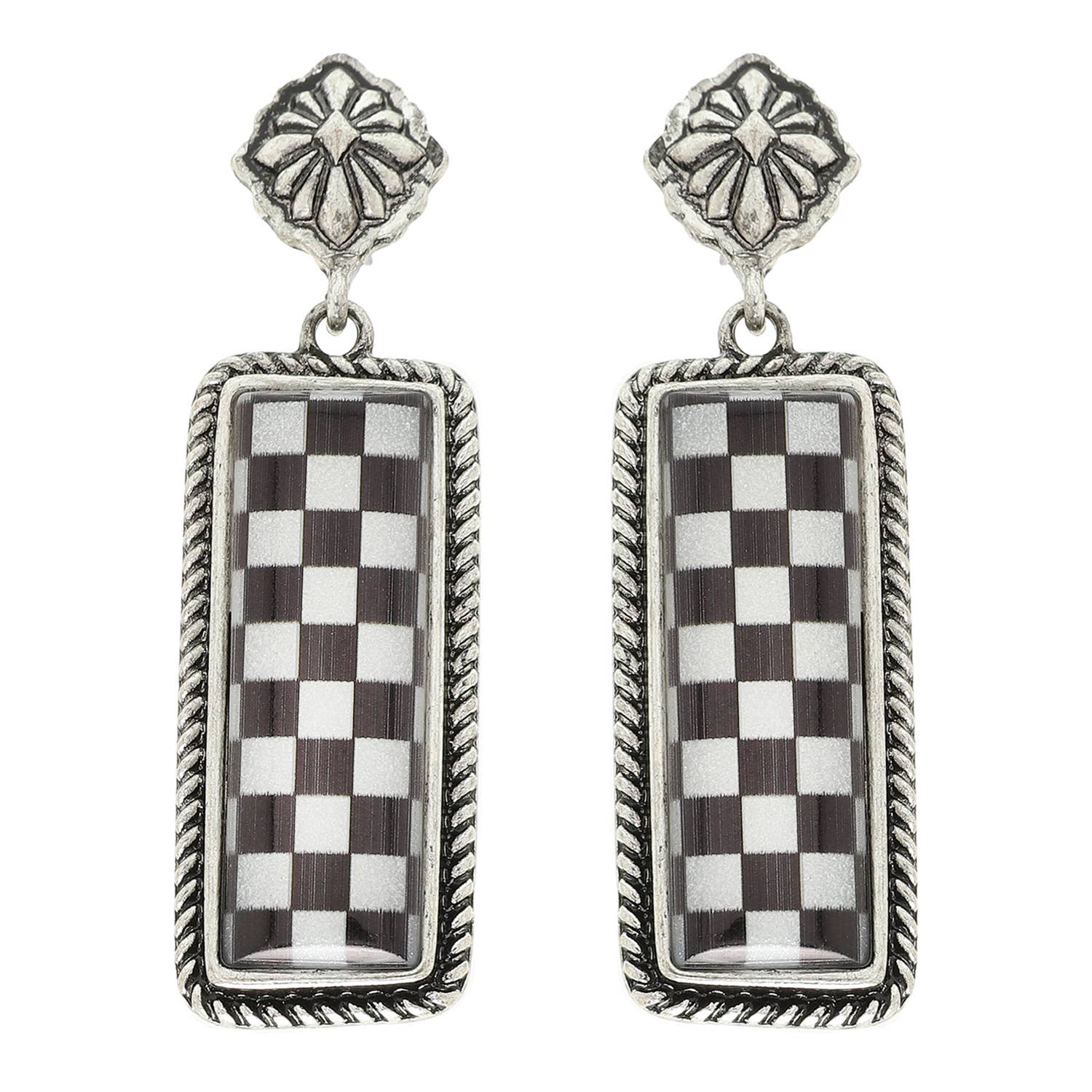 Expertly crafted with Western-inspired design, these bar post earrings feature a unique checkerboard pattern in durable epoxy. Add a touch of rustic charm to any outfit with these timeless and versatile earrings.